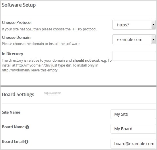 • In Directory: If you want to install this in a directory, for example example.com/forums, enter the directory name. Otherwise, leave this blank to install in your main domain example.com