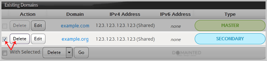 4. Under "Existing Domains " tab, Select Appropriate domain name you want to delete.