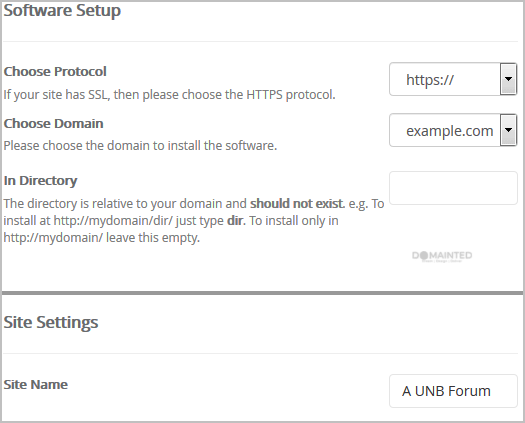 - In Directory: If you want to install this in a directory, for example example.com/forum, enter the directory name. Otherwise, leave this blank to install in your main domain example.com